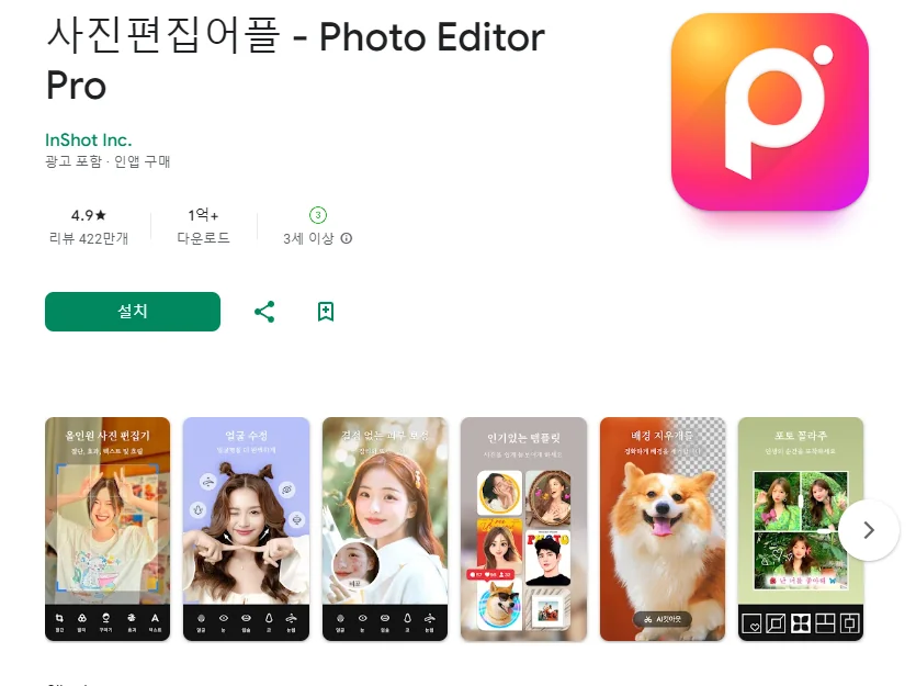 이 어플은 구글플레이스토어에서 "사진 콜라주"로 검색했을때 3번째로 나오는 어플입니다. 아래는 사진편집어플 - Photo Editor Pro 어플에 대한 자세한 설명이니 참고하세요.