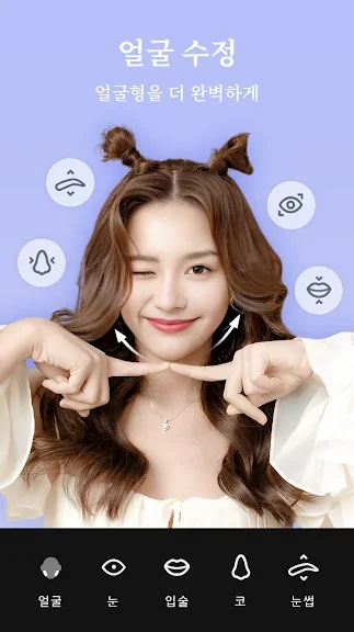 - 자동 얼굴인식(AR) 성형 미용 기능(눈크게/스마일/갸름하게)
