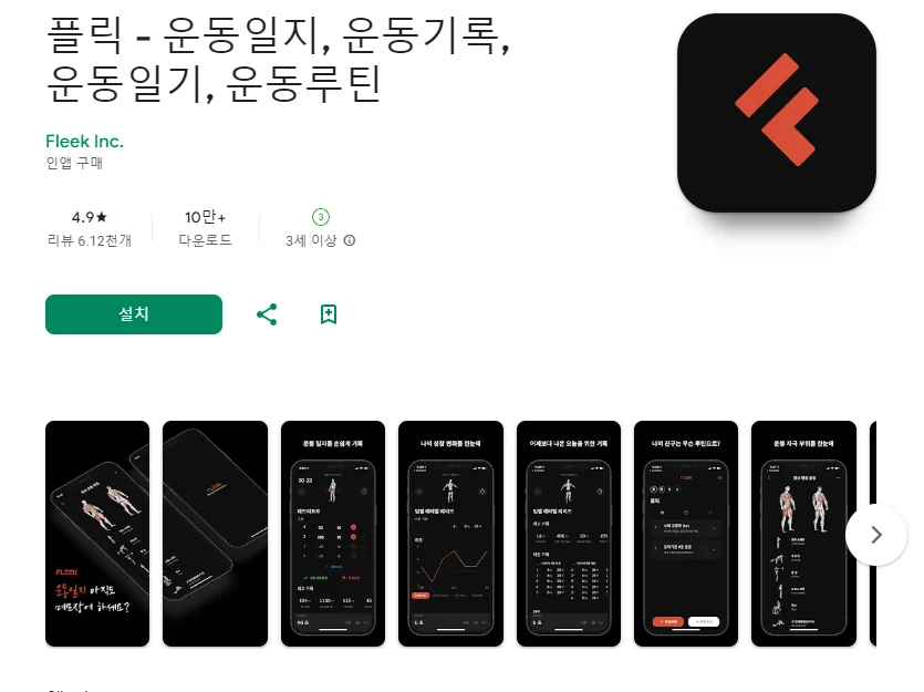 이 어플은 구글플레이스토어에서 "운동 기록"로 검색했을때 2번째로 나오는 어플입니다. 아래는 플릭 - 운동일지, 운동기록, 운동일기, 운동루틴 어플에 대한 자세한 설명이니 참고하세요.