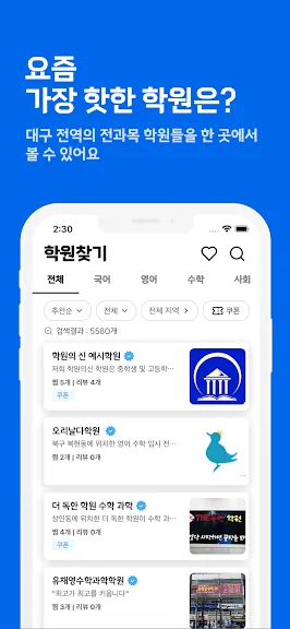 *대구 전역, 약 7500개의 학원들을 학원의 신 어플로 직접 비교할 수 있습니다.