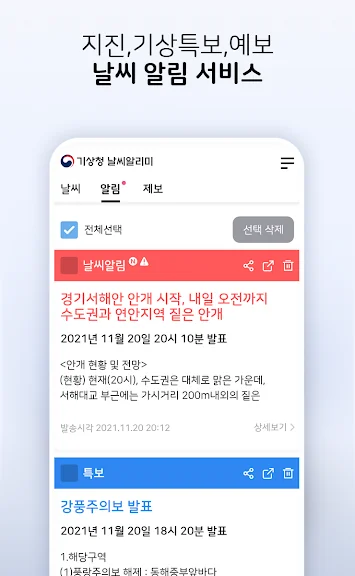앱 실행 시 내가 원하는 지역의 날씨상황을 한 눈에 볼 수 있고 지진, 기상특보 등 위험기상 알림시 알림정보를 바로 확인할 수 있습니다.