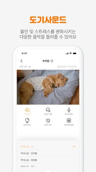 백색소음과 다양한 강아지 음악으로 구성된 도기사운드를 원격으로 들려주세요.