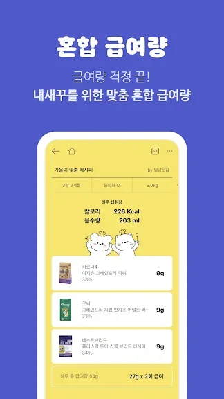 ■ 혼합 급여량 계산: 여러 종류의 사료를 혼합하여 급여할 때, 각 사료별 적정 급여량을 계산할 수 있어 반려동물의 영양 균형을 쉽게 맞출 수 있습니다.