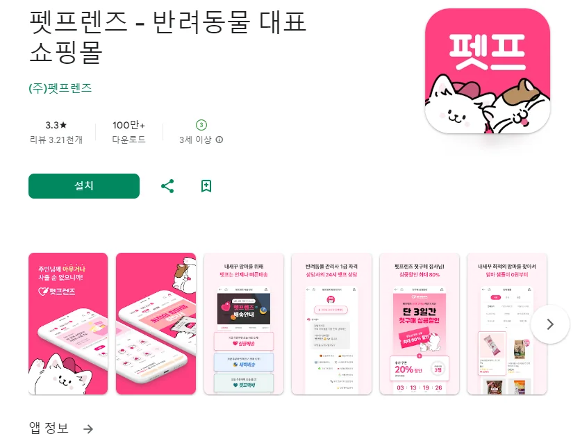 아래는 펫프렌즈 - 반려동물 대표 쇼핑몰 어플에 대한 스크린샷 정보입니다.