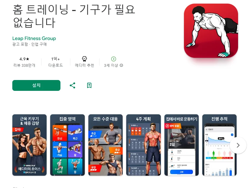 아래는 홈 트레이닝 - 기구가 필요 없습니다 어플에 대한 스크린샷 정보입니다.