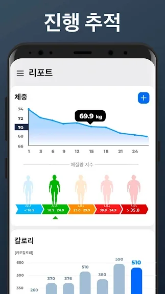 연소된 칼로리와 체중 감량 과정을 그래프로 확인할 수 있습니다. 헬스장에 갈 필요도, 장비도 필요 없어요. 그냥 체중을 이용하는 것만으로도 몸 전체를 탄력 있게 만들고 탄탄한 근육을 만들 수 있어요.