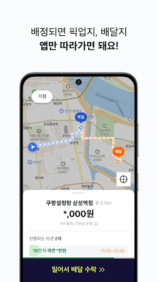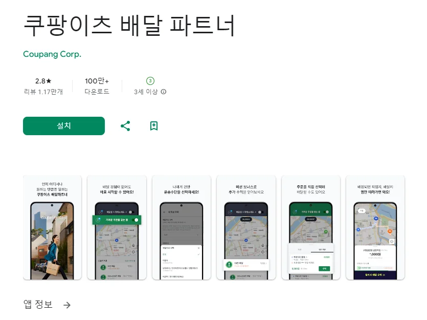 아래는 쿠팡이츠 배달 파트너 어플에 대한 스크린샷 정보입니다.