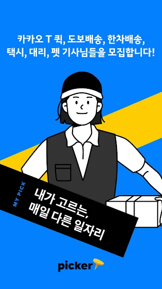 아래는 카카오 T 픽커 - 퀵/도보, 세차/정비, 택시, 대리 어플에 대한 스크린샷 정보입니다.