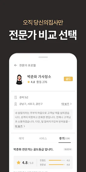 프로필, 평점/후기를 보고 청소 전문가를 내가 직접 선택