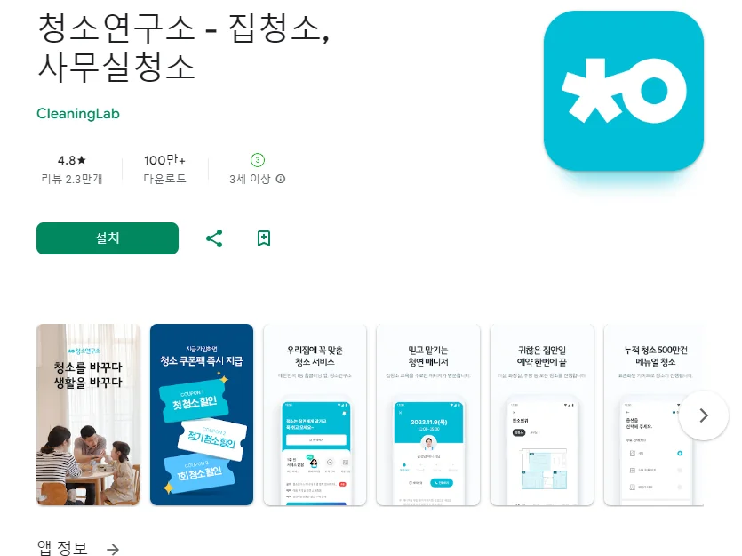이 어플은 구글플레이스토어에서 "청소 도우미"로 검색했을때 1번째로 나오는 어플입니다. 아래는 청소연구소 - 집청소, 사무실청소 어플에 대한 자세한 설명이니 참고하세요.