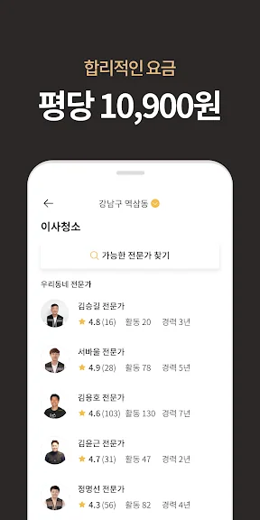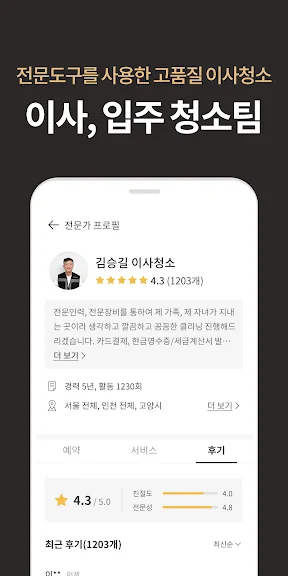 프로필, 평점/후기를 보고 청소 전문가를 내가 직접 선택