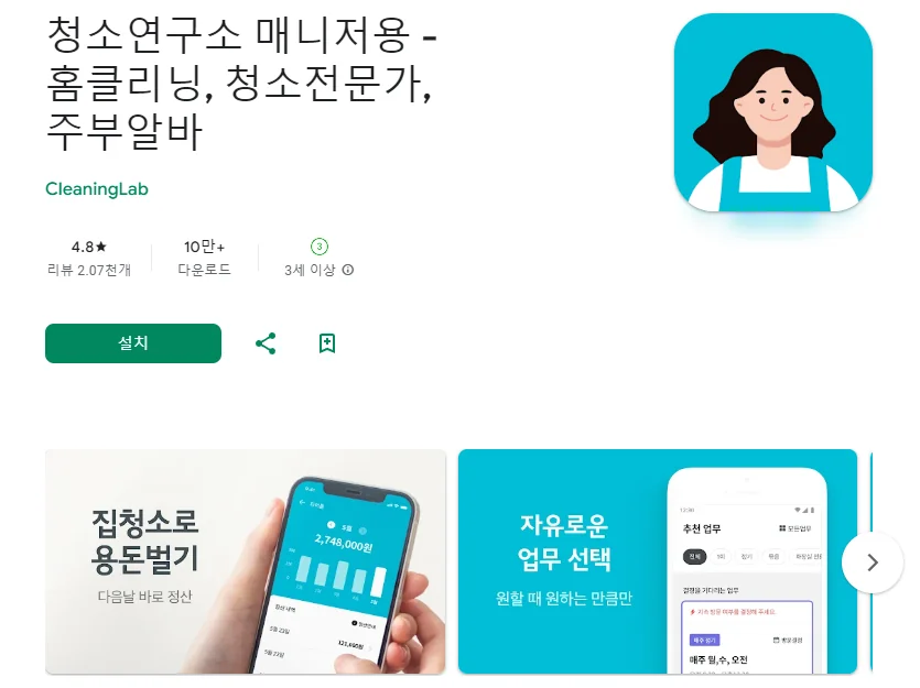 이 어플은 구글플레이스토어에서 "청소 도우미"로 검색했을때 4번째로 나오는 어플입니다. 아래는 청소연구소 매니저용 - 홈클리닝, 청소전문가, 주부알바 어플에 대한 자세한 설명이니 참고하세요.