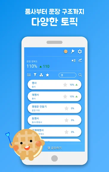 앱을 실행하면 품사, 동사/준동사, 관계사 등 다양한 문법 토픽이 제공됩니다. 각 토픽마다 퀴즈를 풀면서 문법 정복도를 올릴 수 있습니다. 정복도가 올라갈수록 새로운 캐릭터가 해금되어 학습 동기를 높여줍니다.
