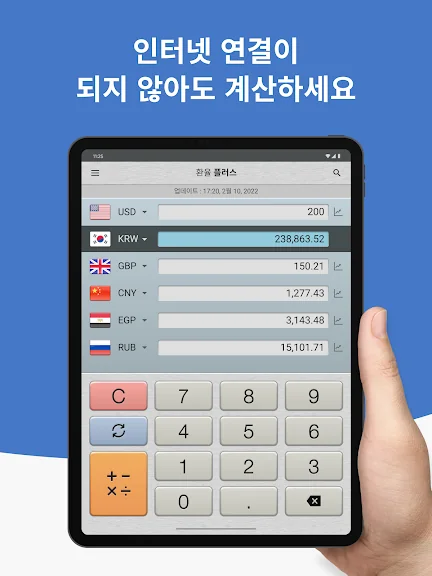 정확한 ™의 실시간 환율 정보를 사용하여 전 세계 모든 통화를 무료로 변환하고 환율을 계산해 주는 통화 변환기 및 계산기입니다. Calculator Plus의 제작자들이 제작한 Currency Converter Plus Free는 전 세계 모든 통화에 대해 간편하게 사용할 수 있는 통화 변환기로 이를 통해 환전 시 그 금액을 예상할 수 있습니다. 물론, 외국 여행 시, 알고 있으면 좋은 요령이나 할인, 쇼핑 상품 정보 등에 대해 퍼센트로 표시해 주는 계산기가 탑재되어 있습니다. 오늘 시점으로 괜찮은 거래인지 확인하기 위해 상점 가격을 오늘 시점의 자국 통화로 변환해 비교해볼 수 있습니다. 환율 데이터를 사용할 수 없을 때 여행 도중 오프라인으로도 사용할 수 있습니다.