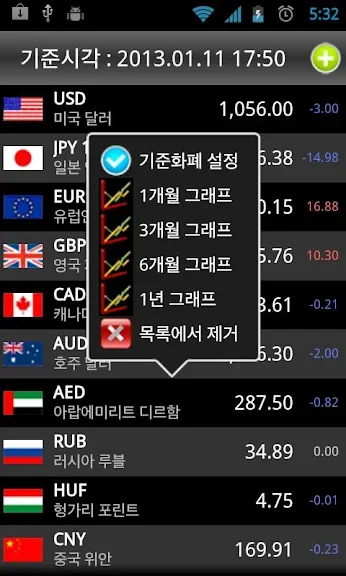 우측 상단의 'PLUS' 아이콘을 터치하면 국가를 추가할 수 있으며 목록에서 원하는 국가를 롱터치하면 기준화폐변경, 그래프, 목록에서 삭제 등을 하실 수 있습니다.