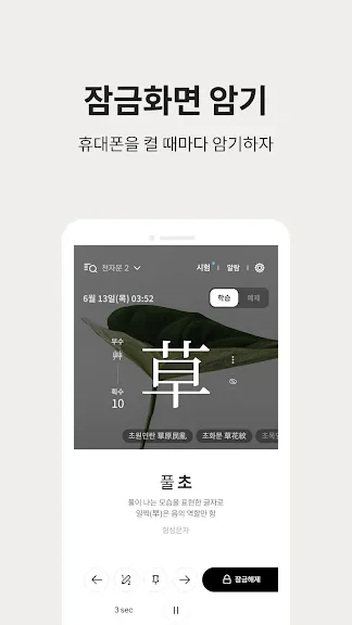 사용자가 휴대폰을 켤 때마다 잠금화면에서 한자를 수시로 보여줌으로써 한자 암기를 극대화합니다.