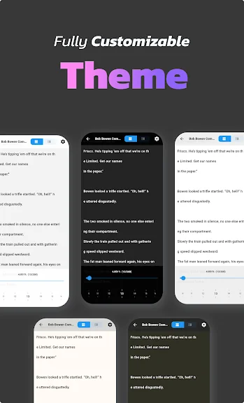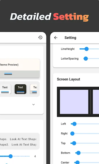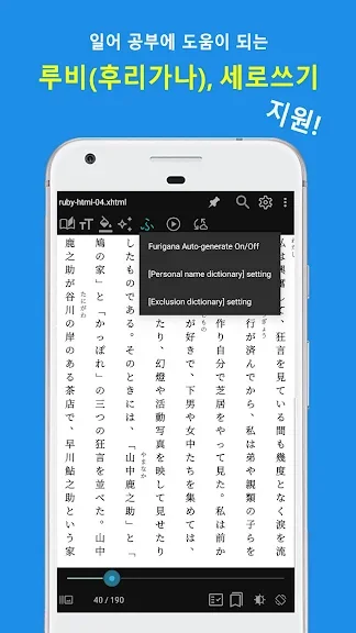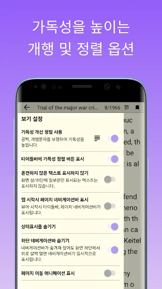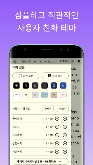 마지막으로 읽은 위치 저장, 두쪽 보기, 텍스트 모양 설정, 테마 설정 등 필요한 기능들이 구현되어 있습니다.