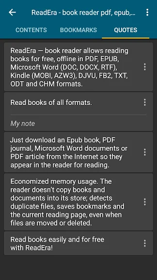 ReadEra — 책 리더를 사용하면 PDF, EPUB, Microsoft Word (DOC, DOCX, RTF), Kindle (MOBI, AZW3), DJVU, FB2, TXT, ODT 및 CHM 형식으로 무료로 오프라인으로 책을 읽을 수 있습니다.