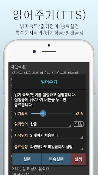 - 읽어주기 : 언어선택, 속도조절, 특수문자/한자 제외 옵션,백그라운드 동작
