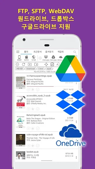 ✔️ FTP, SFTP, SMB, 드롭박스, 원드라이브, 구글드라이브, WebDAV 지원