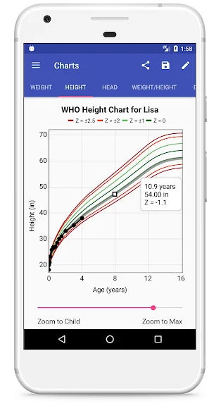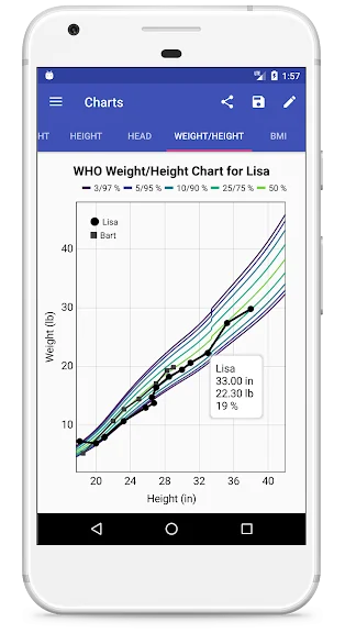자녀의 차트 또는 백분위수 표의 이미지를 저장하여 공유하거나, 아기 책에 넣거나, 자녀의 담당 의사와 논의할 때 가져갈 수 있습니다. 데이터를 개방형 CSV 형식으로 쉽게 내보내고 가져올 수 있습니다. 성장 차트와 백분위수 표가 포함된 PDF 보고서를 생성합니다. 여러 자녀의 성장 곡선을 비교하거나 부모의 데이터를 입력하고 자녀를 부모와 비교합니다. 각 곡선의 끝까지 성장을 계획합니다.