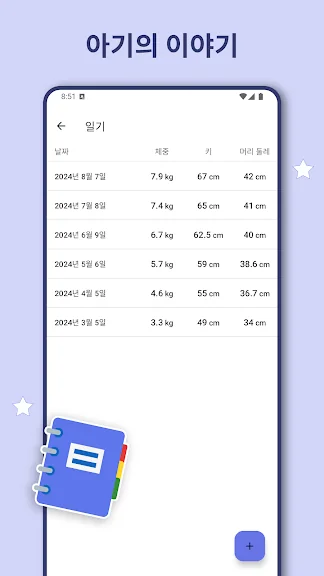 - 체중 증가 추적: 아기의 체중을 시간에 따라 기록하고 추적하세요.