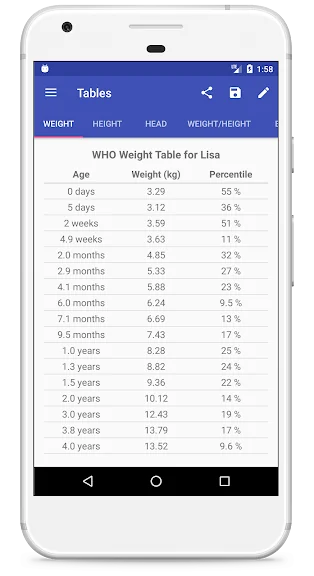 CDC, WHO, IAP(인도), 스웨덴어, 스페인어, 독일어, TNO(네덜란드), 벨기에, 노르웨이어, 일본 및 중국(및 기타!) 차트와 미숙아에 대한 Fenton 재태 연령 차트가 포함되어 있습니다. 모든 연령대의 체중과 BMI를 추적하기 위한 아기 및 성인 차트. 또한 CDC 및 IAP 권장 조합 차트(WHO-CDC는 2세에 전환, WHO-IAP는 5세에 전환)와 출생 시 WHO 곡선으로 보정된 연령을 사용하는 Preterm-WHO도 있습니다. 모든 백분위수는 병원에서 자주 사용하는 것과 동일한 고정밀 LMS 방법을 사용하여 계산됩니다.