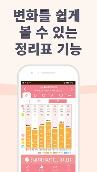 · 수유시간, 분유량, 수면시간 등을 1일 단위로 자동 집계하여 표시해줍니다.