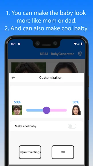 우리의 앱은 인공 지능의 최신 기술을 사용하여 얼굴 특징을 분석하고 미래 아기의 얼굴을 예측합니다.