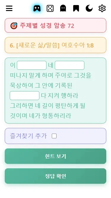 5) 상단의 게임 아이콘을 클릭하면 퀴즈모드로 바뀝니다. 정답의 내용 일부가 가려지며 인풋박스에 정답을 입력하여 정답이 맞는지 틀린지 확인가능합니다. 힌트보기를 클릭하며 초성을 알려줍니다.
