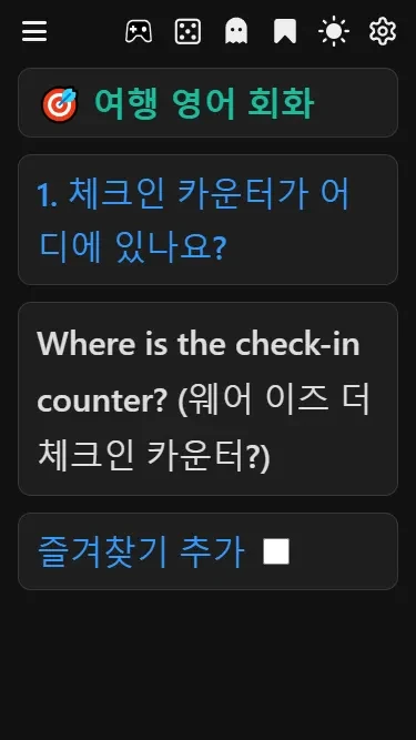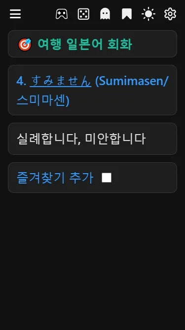 암기수첩을 초기에 열면 위와 같은 이미지가 반길것입니다. 상단의 초생달 아이콘 또는 태양 아이콘 을 클릭하면 다크모드 또는 라이트 모드로 변경됩니다.