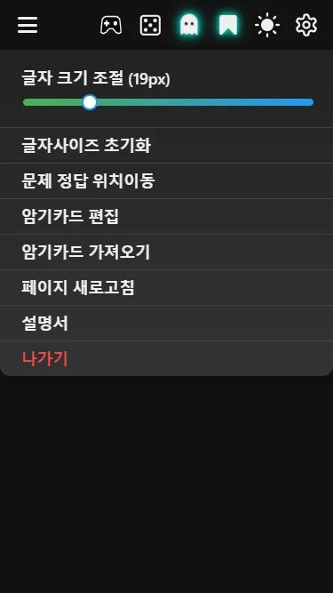 4) 상단의 유령 아이콘을 클릭하면 정답을 안보이게 하며 한번더 클릭하면 보이게 됩니다. 외운 내용을 확인할때 사용하면 유용합니다.