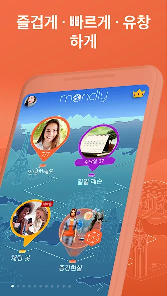 실제 상황에서 쓰이는 유용한 문장. 잘 쓰이지 않는 수백 개의 단어를 암기하는 것은 외국어 공부에 적합한 방법이 아닙니다. 몬들리는 여러분에게 핵심 문장과 어휘를 통해 스페인어 단어를 가르칩니다. 이 앱에서는 여러 교육 과정을 짧은 수업으로 나누고 그 수업을 테마별로 엮어 놓았습니다.