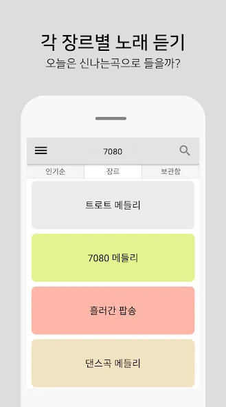 그 시절의 추억을 떠올리게 하는 7080 추억노래 - 7080 명곡 모음이 여러분 곁에 왔어요. 이 앱에서는 7080 노래모음을 한눈에 정리해서 보고, 좋아하는 곡들을 쉽게 찾을 수 있답니다. 전체 인기순이나 장르별 인기순으로 정리돼 있어, 어떤 노래를 들을지 고민할 필요도 없어요.