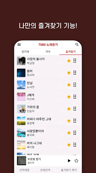 이 앱은 다양한 7080 노래모음은 물론, 5060, 8090 노래도 함께 들을 수 있어요. 좋아하는 곡은 즐겨찾기에 저장하거나 플레이리스트로 만들어 두면 더욱 편하게 감상할 수 있죠. 큰 글씨 가사도 함께 보여줘서 노래를 따라 부르기에도 딱이고요.