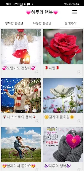 * 좋은글모음 기능이란 '하루의 행복' 앱에서 제공하는 좋은글, 좋은시, 명언 중에서 간직하고 싶은 글들을 한 곳에 모아서 즐겨찾기 하는 기능입니다.